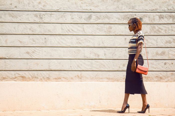 The right shoes for this look are essential considering the length of the midi skirt..spotting heels with interesting details is recommended..Heels as opposed to flats continues the long lean line of the skirt.Always remember the right shoes are key.