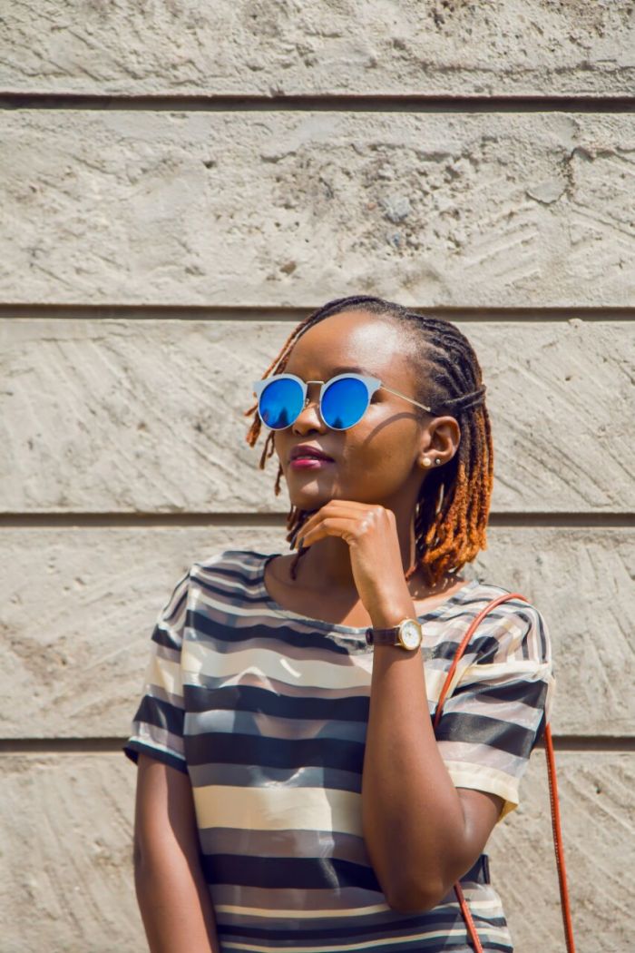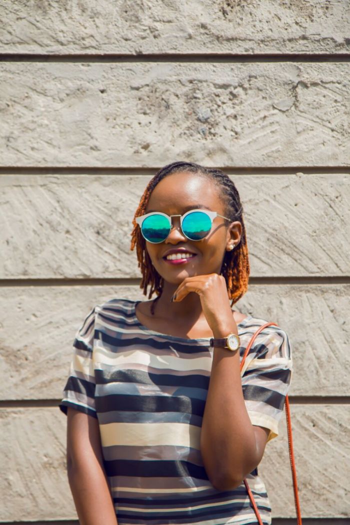 I went for a monochromic striped sheer top,a brown sling bag, sunglasses and black detailed pump…
