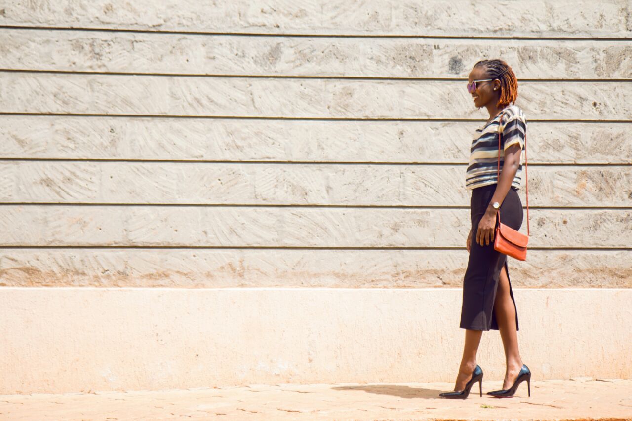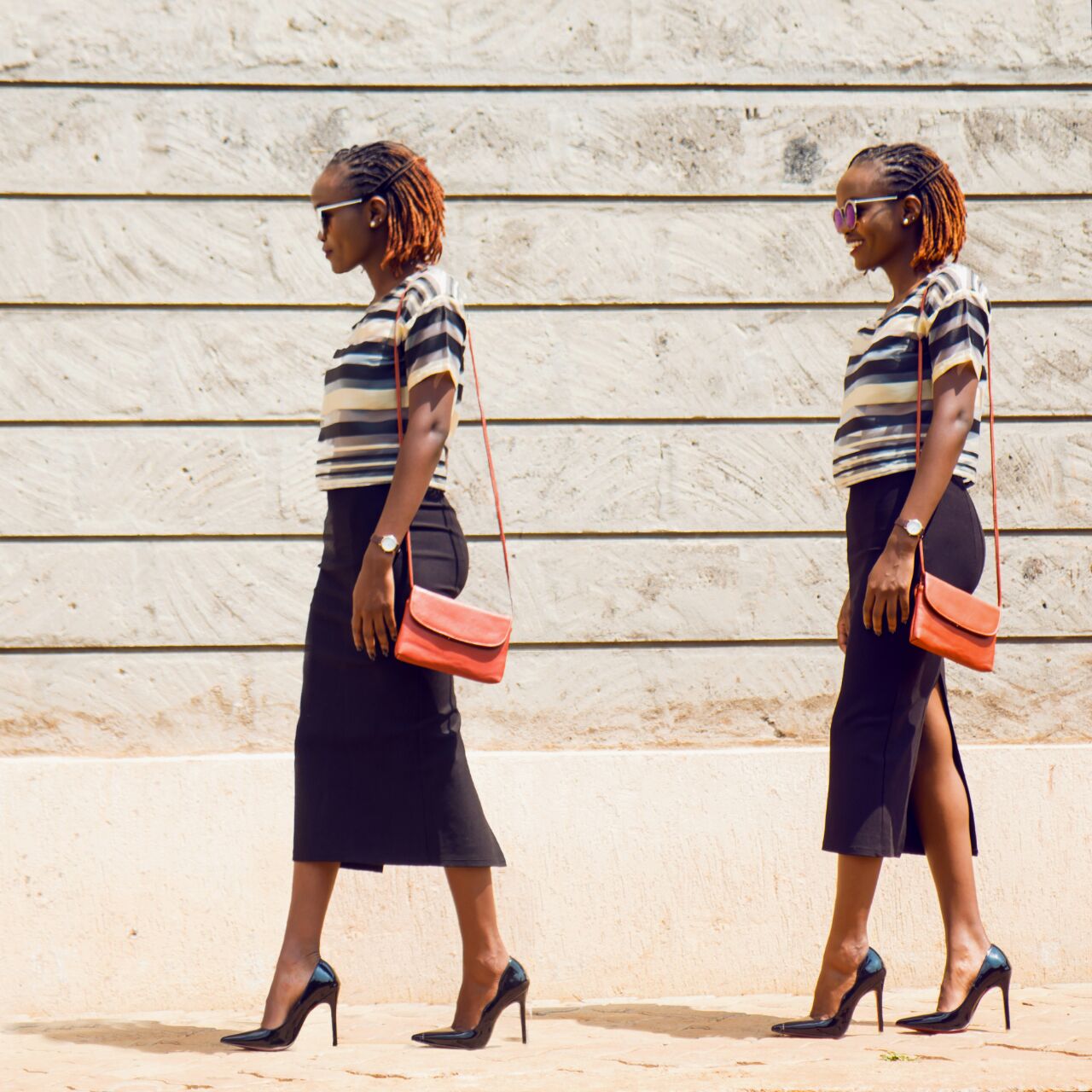 The right shoes for this look are essential considering the length of the midi skirt..spotting heels with interesting details is recommended..Heels as opposed to flats continues the long lean line of the skirt.Always remember the right shoes are key.