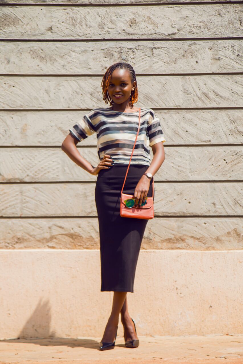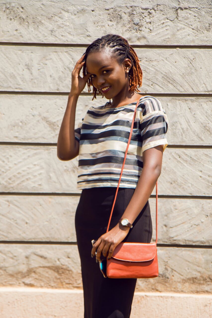 I went for a monochromic striped sheer top,a brown sling bag, sunglasses and black detailed pump…